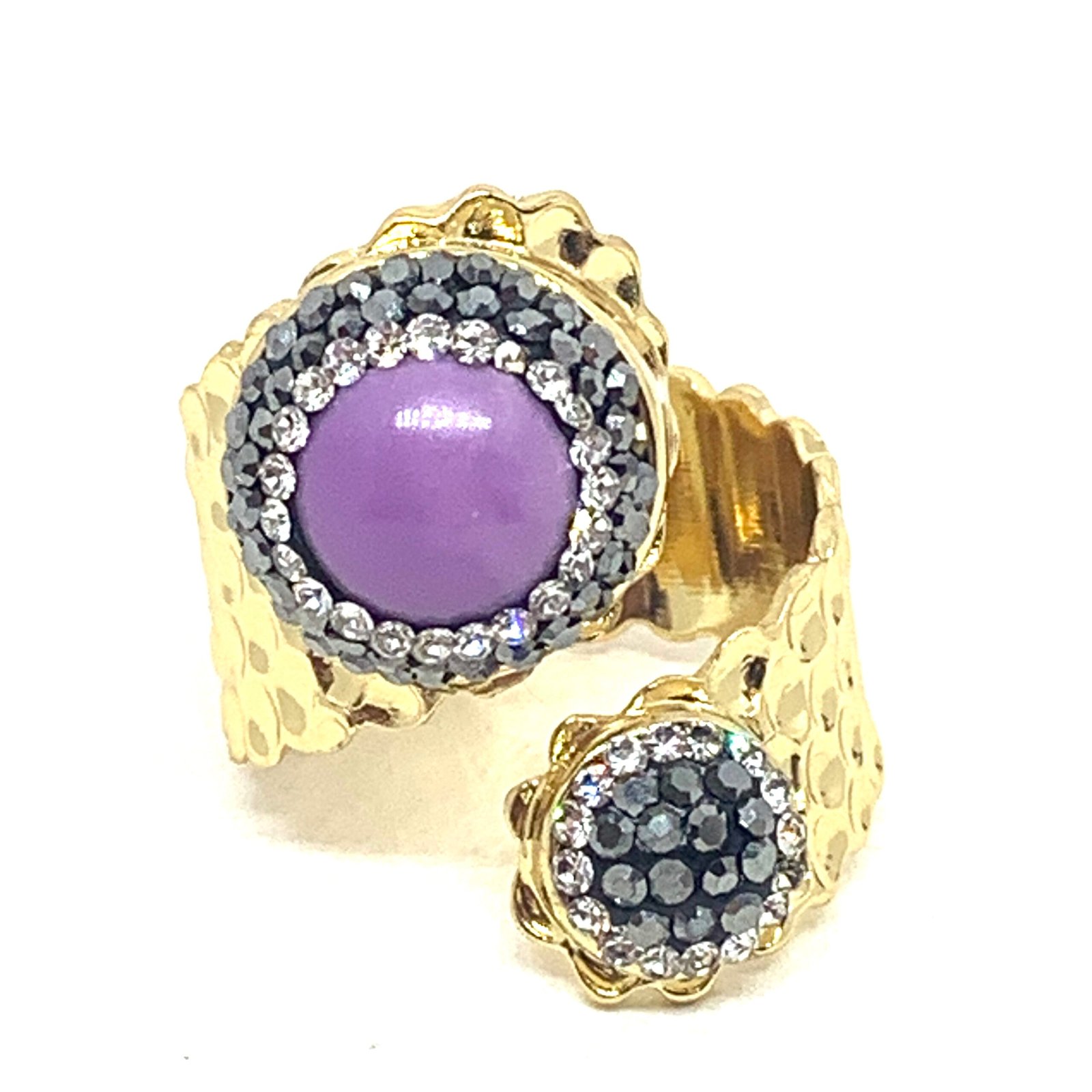 Anello con montatura regolabile, ornato da una pietra semi preziosa incastonata con piccoli strass e da un secondo cabochon strassato.