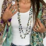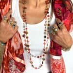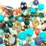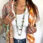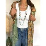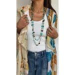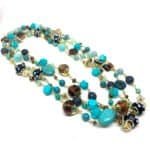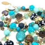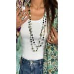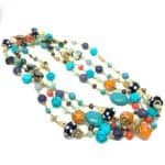 Collana lunga realizzata con perline di vetro, perline sfaccettate multicolore e perline a forma di fiore