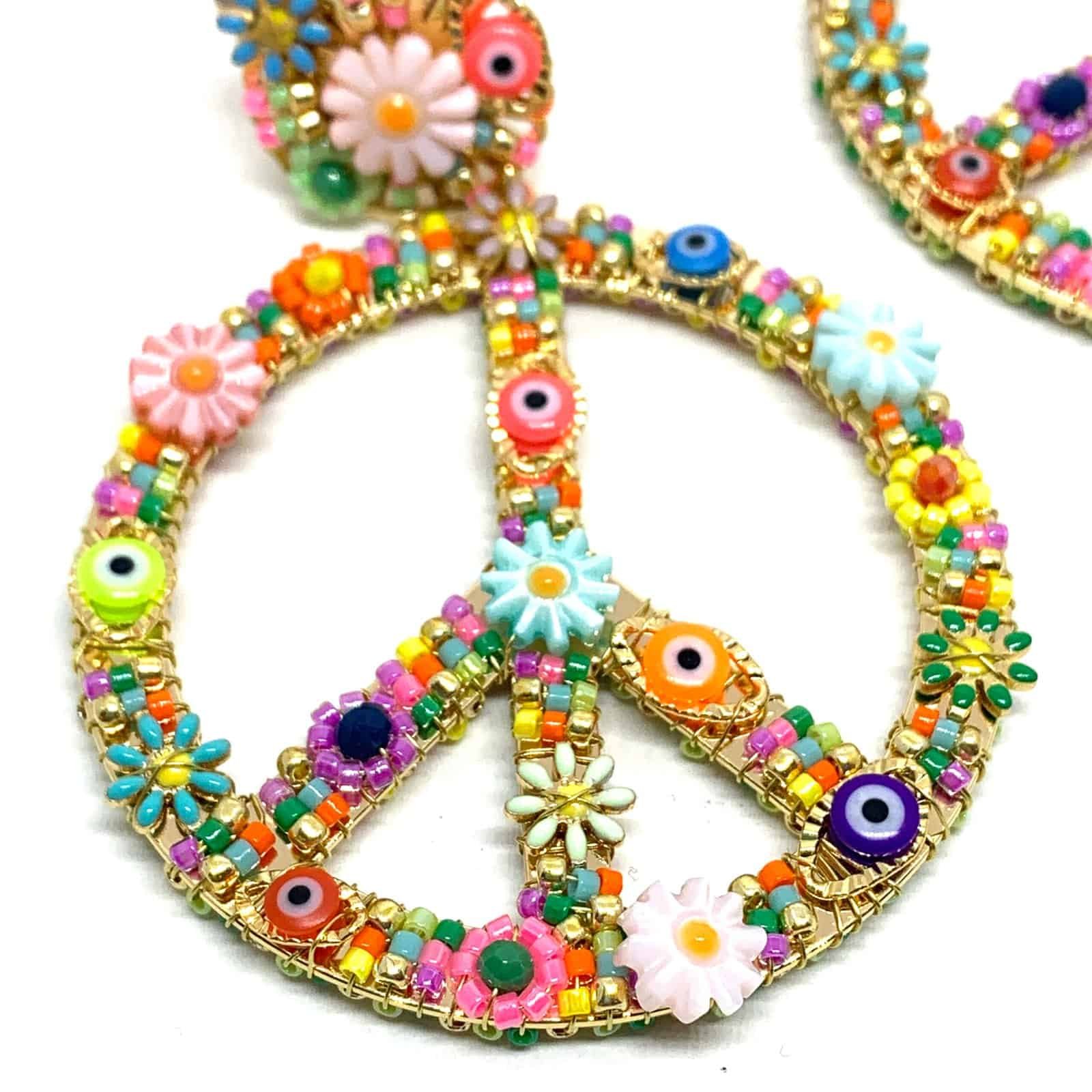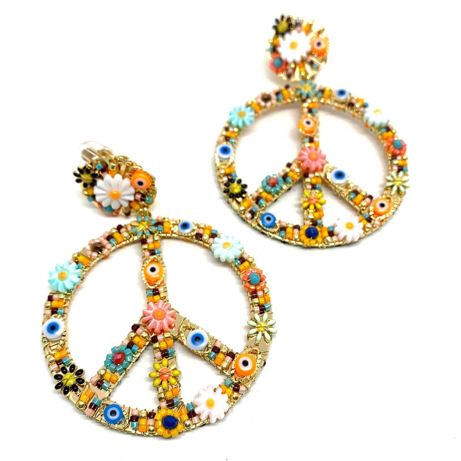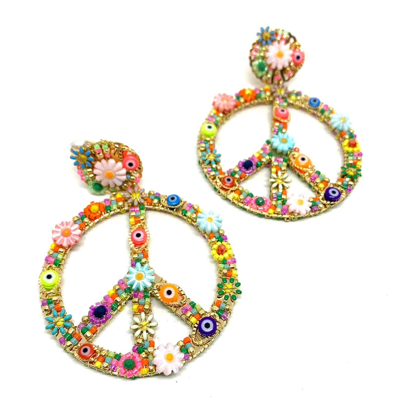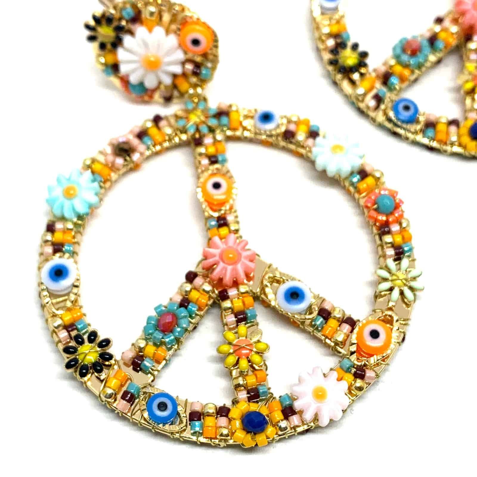 Orecchini a cerchio Peace and Love con perline Miyuki multicolore, fiori e perline Oeil protecteur