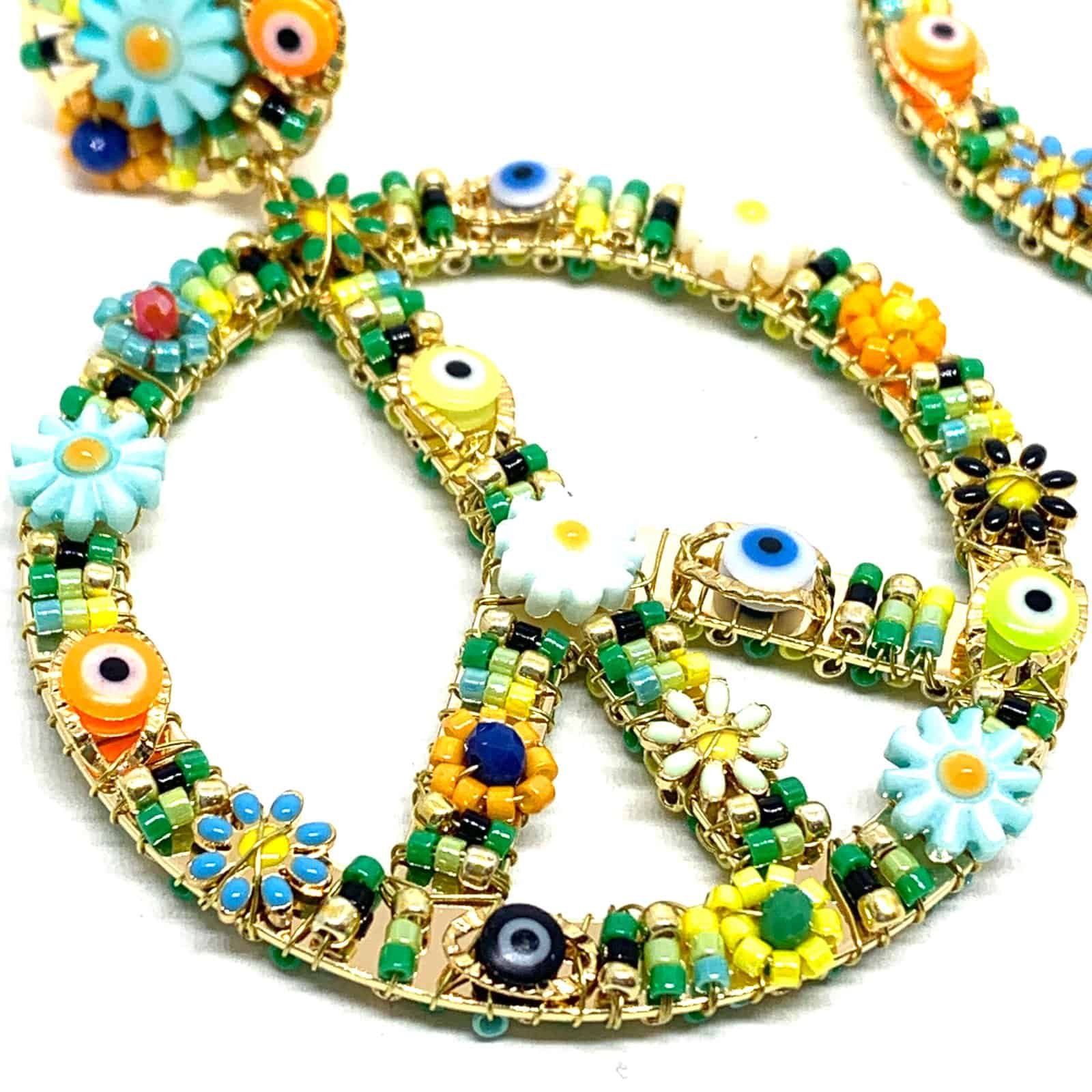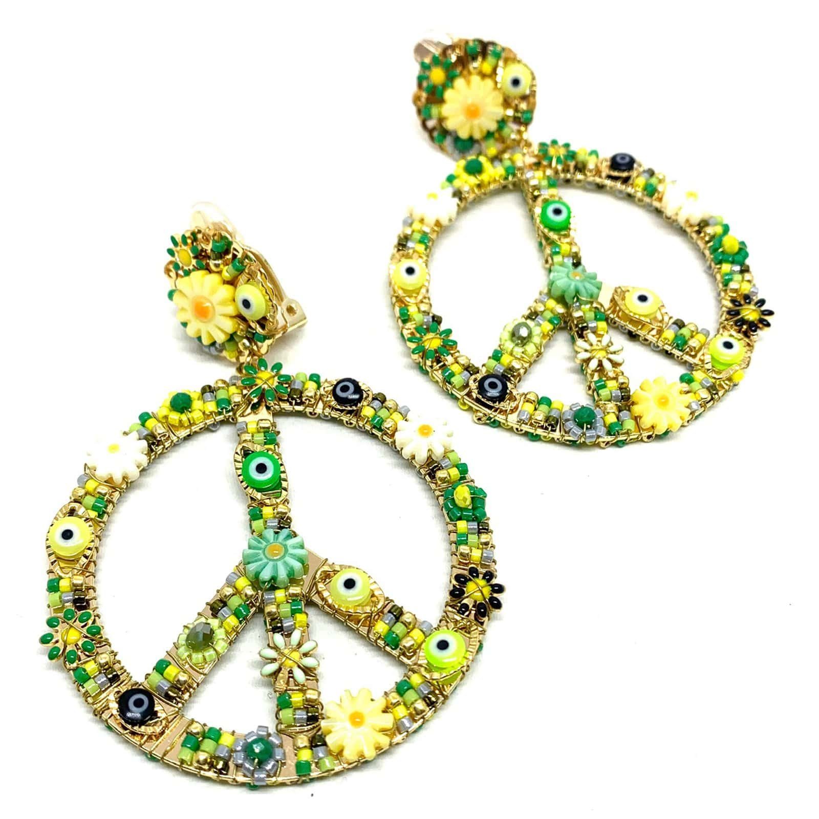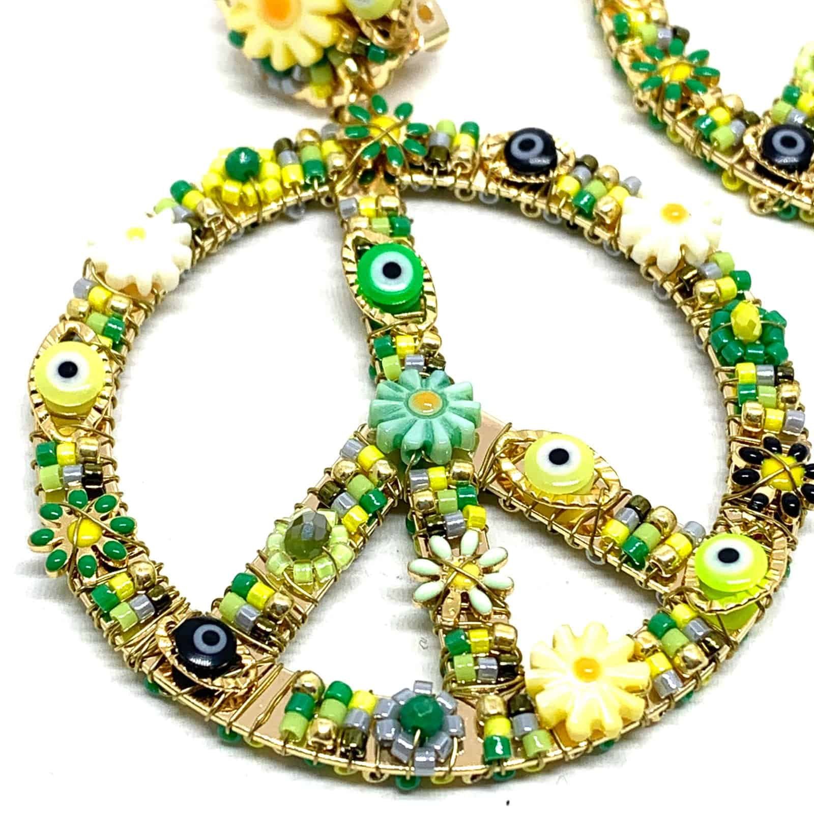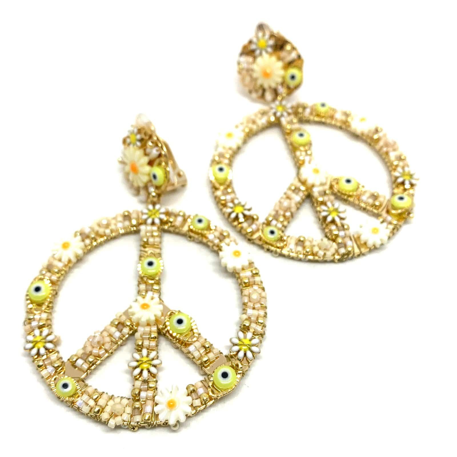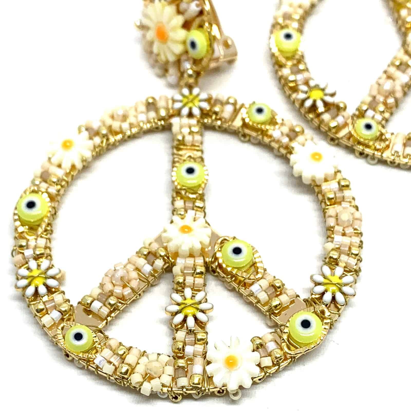 Orecchini a cerchio Peace and Love con perline Miyuki multicolore, fiori e perline Oeil protecteur