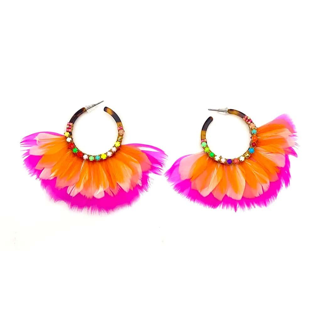 The creole is trimmed with multicoloured glass beads and finished with feathers in a yellow/black gradient.