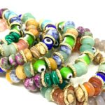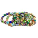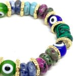 Elastic wire bracelet with natural stones, protective eye, glass beads and gold-plated parts.