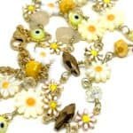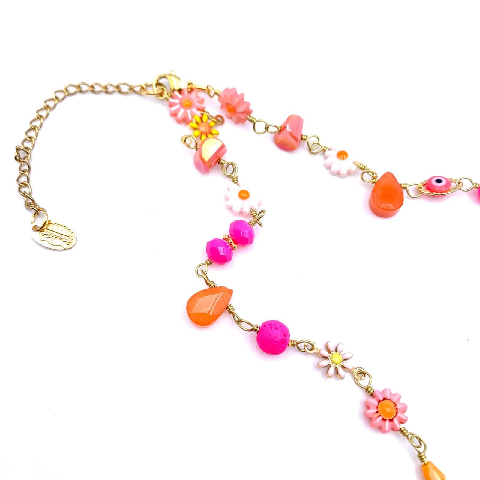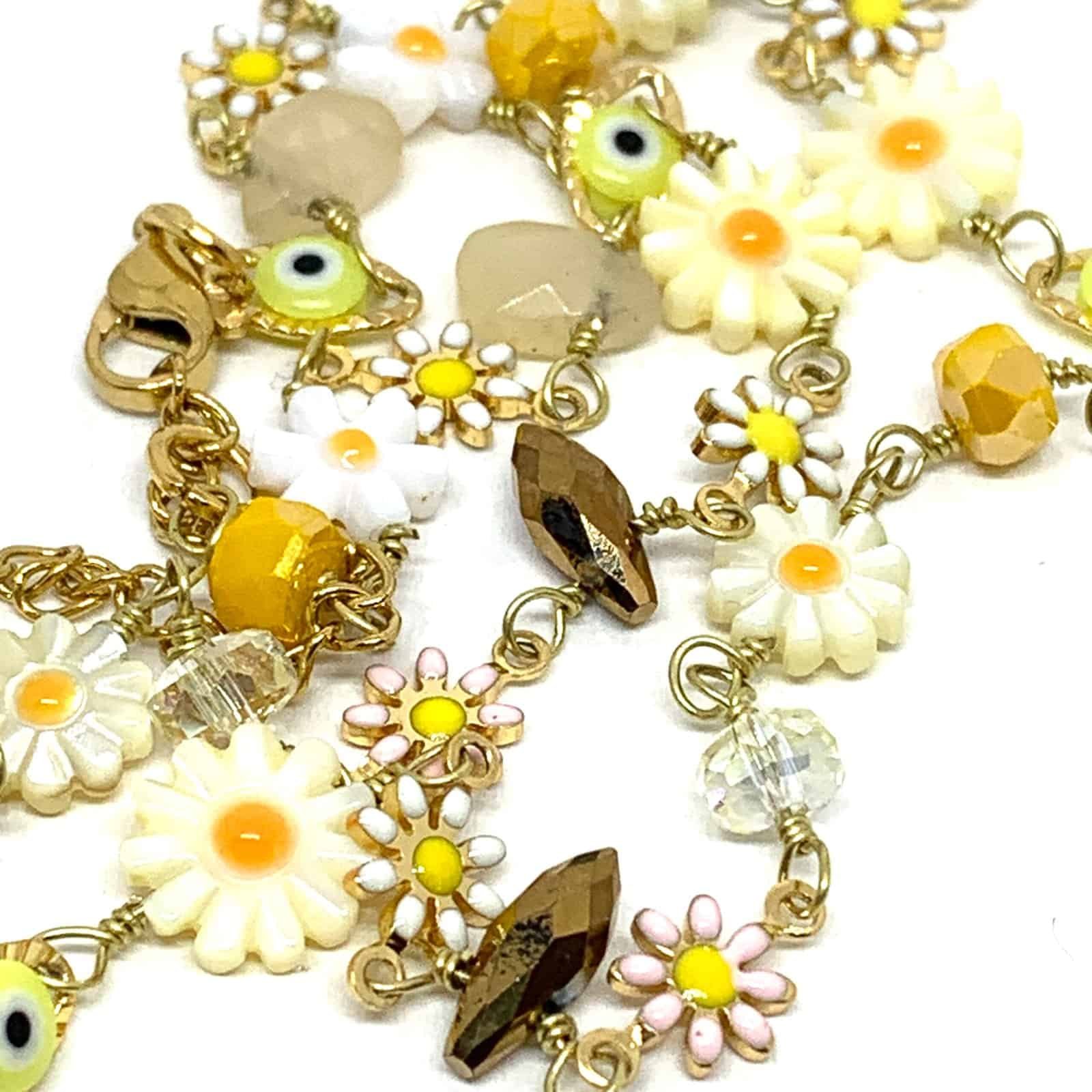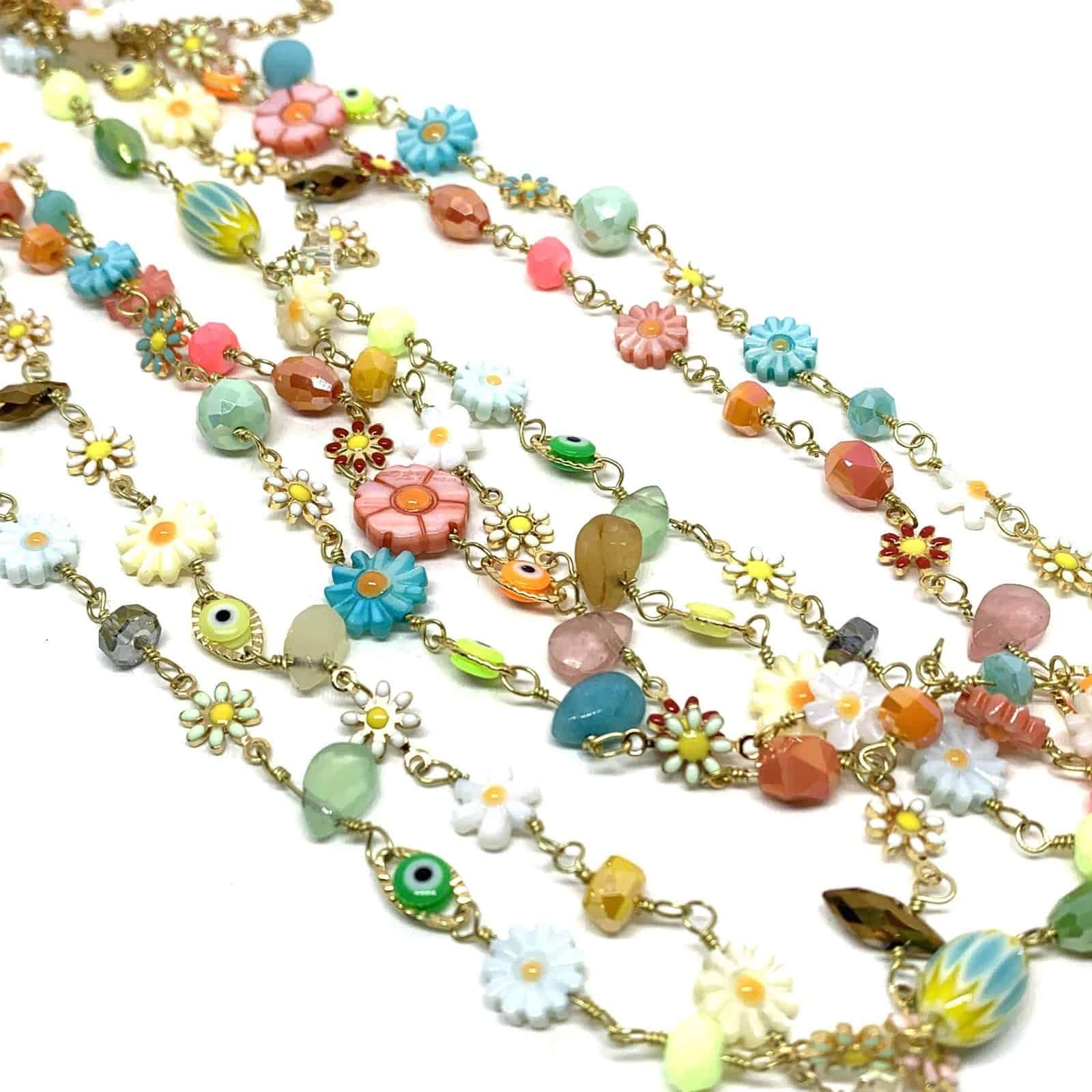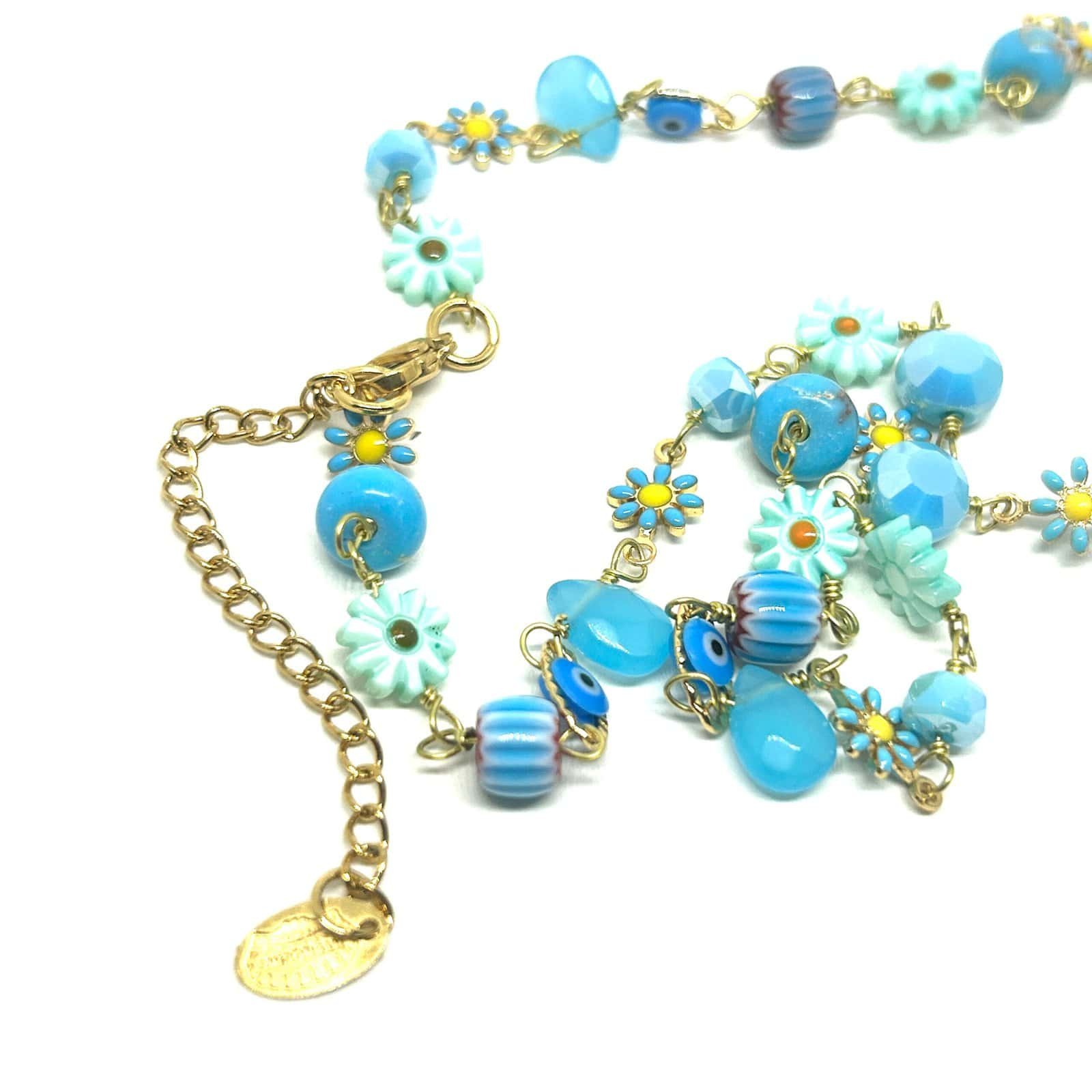 Necklace on gold-plated chain with multicolored flower beads, protective eye beads and faceted glass beads.