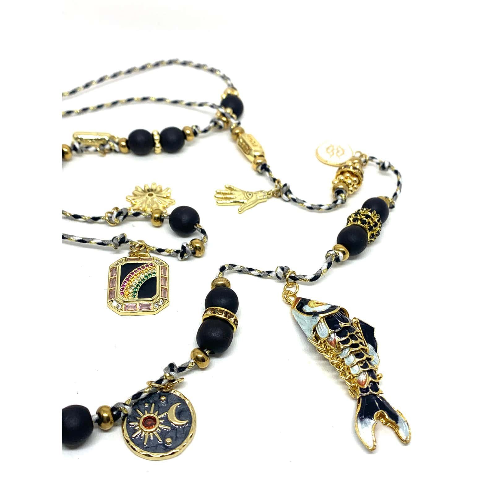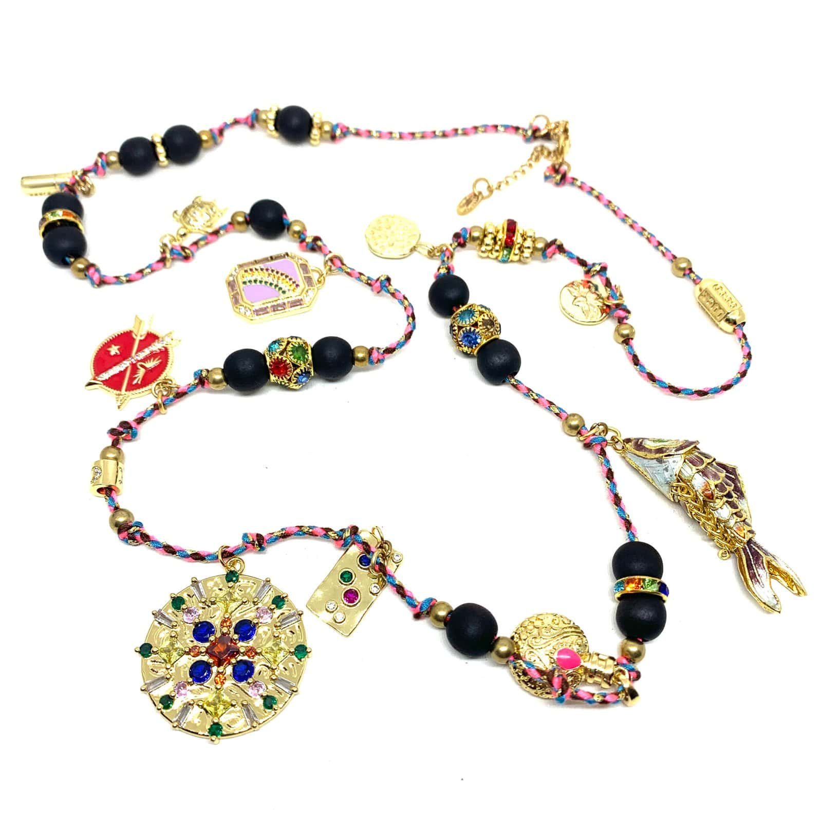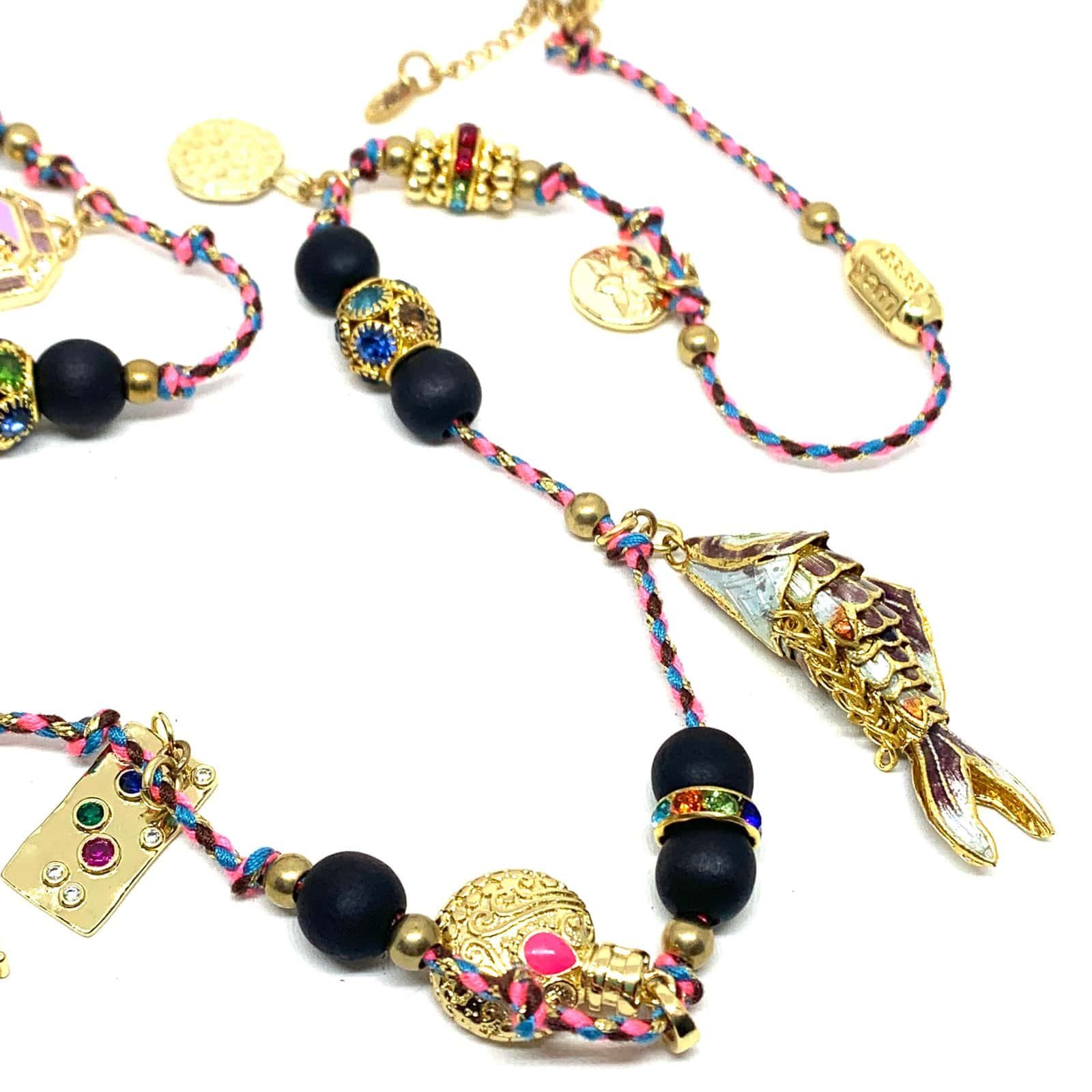 Long necklace on braided rope with 14 ct gold-plated pieces, enameled pieces, rhinestones and a fish.
