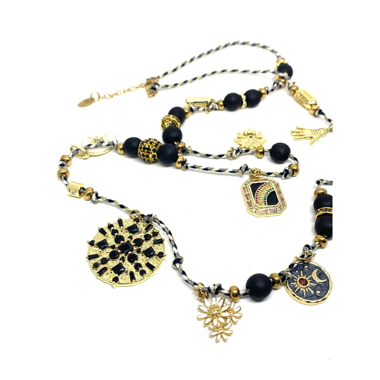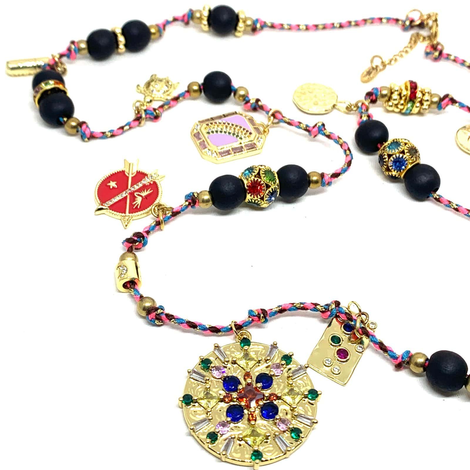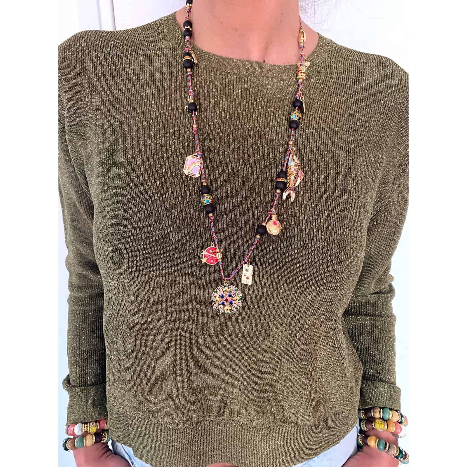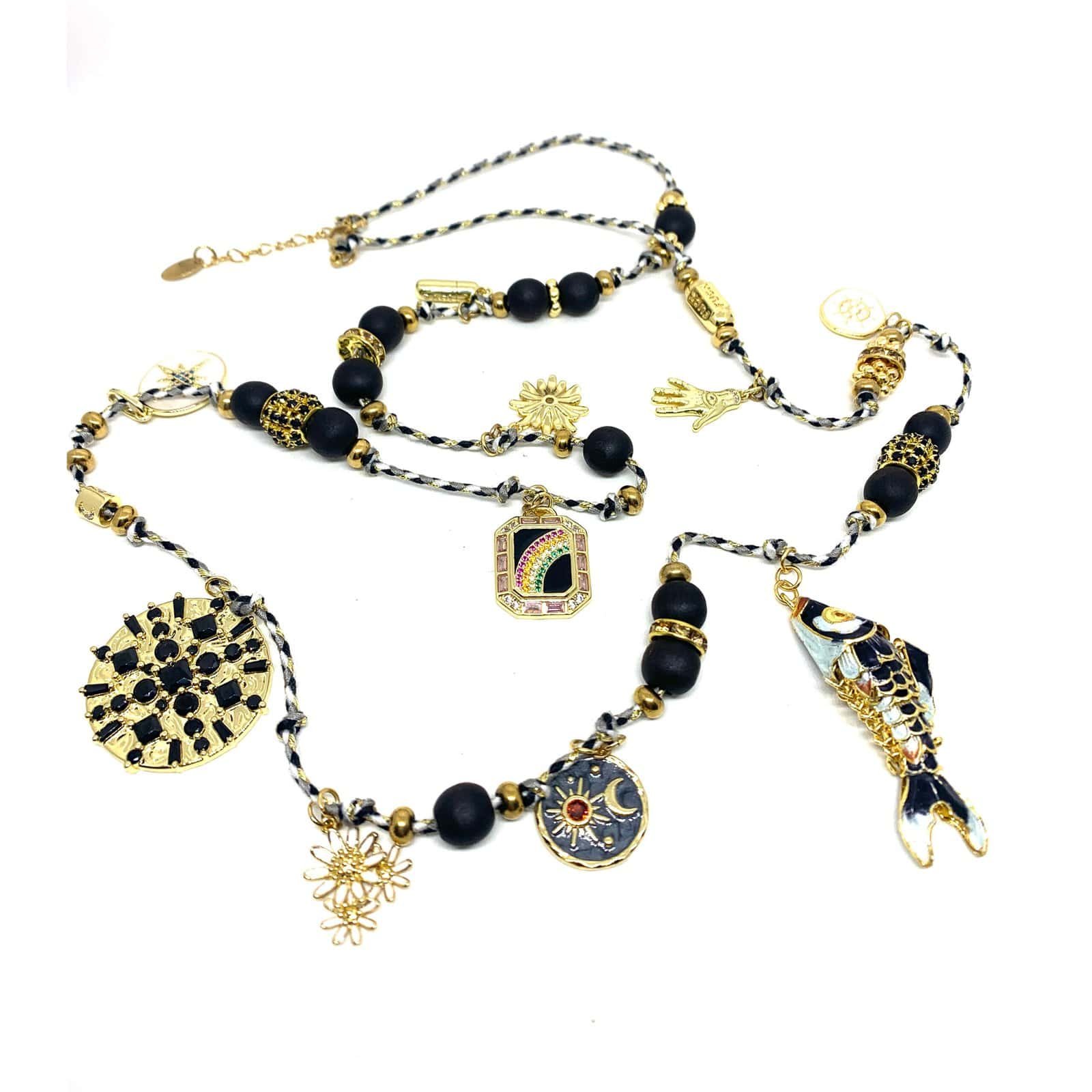 Long necklace on braided rope with 14 ct gold-plated pieces, enameled pieces, rhinestones and a fish.