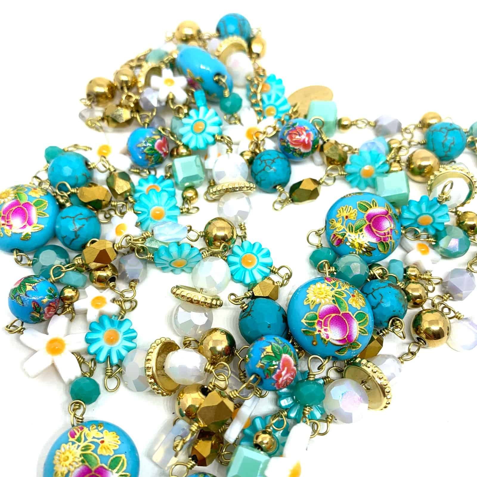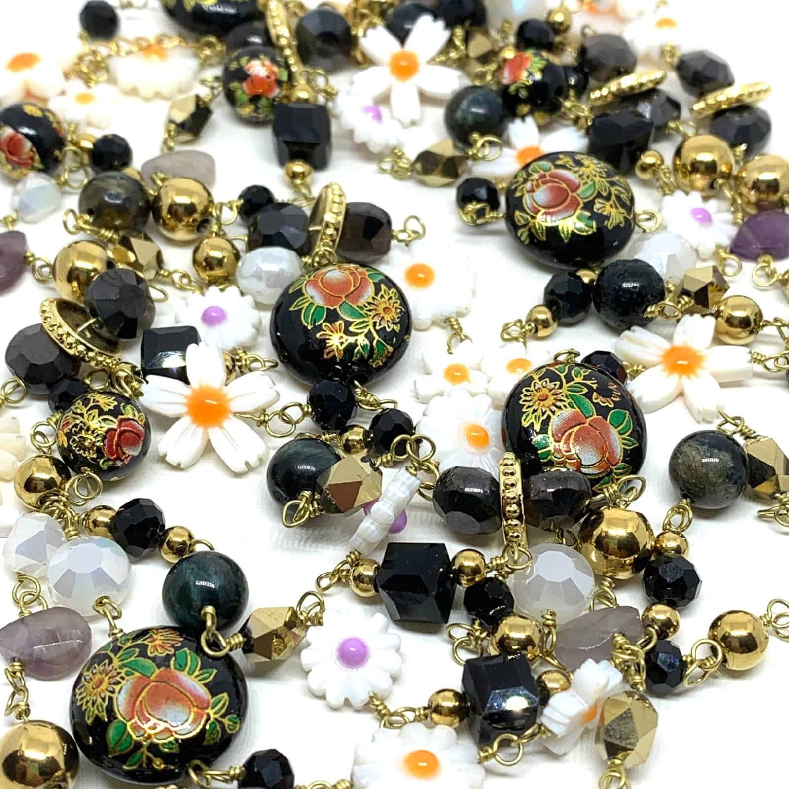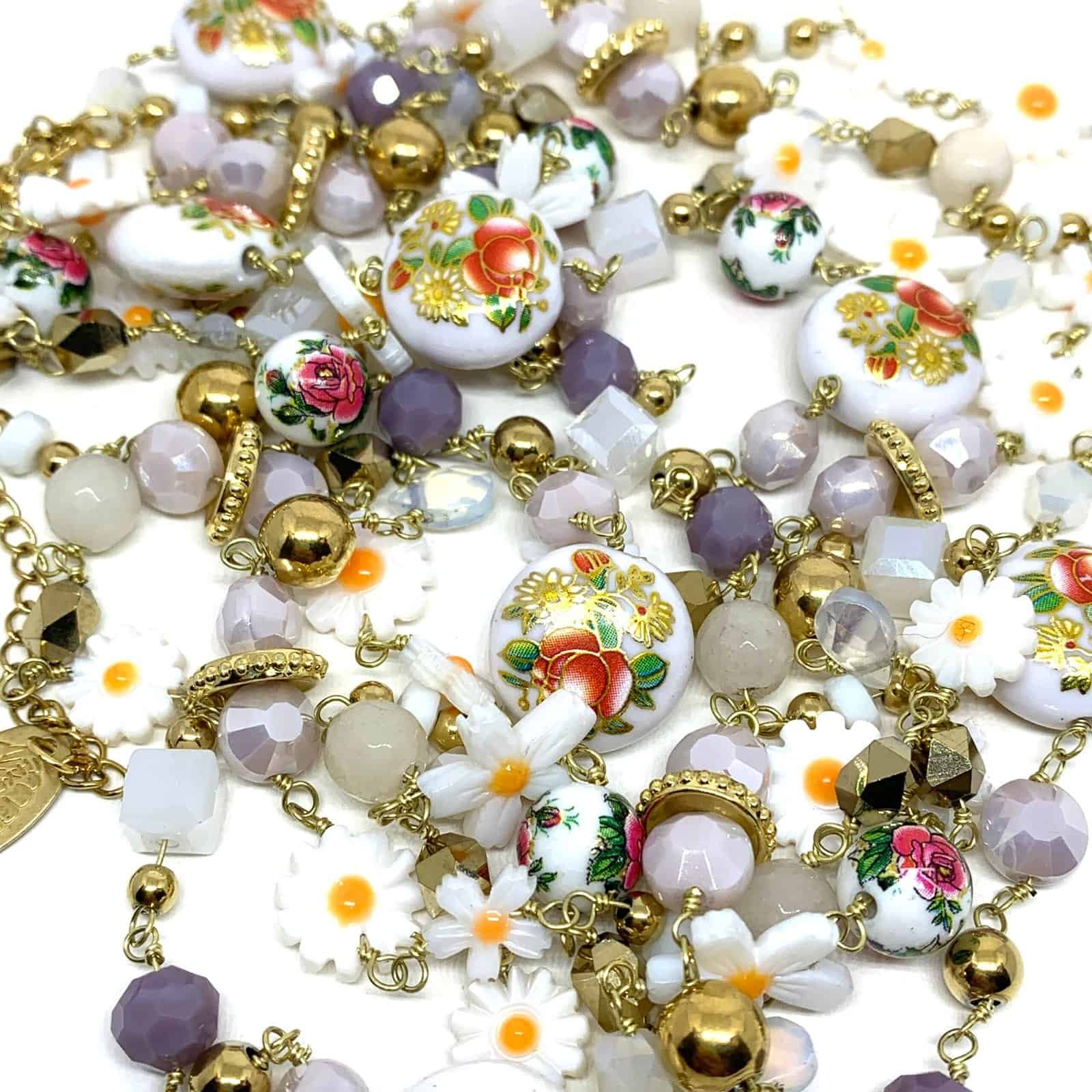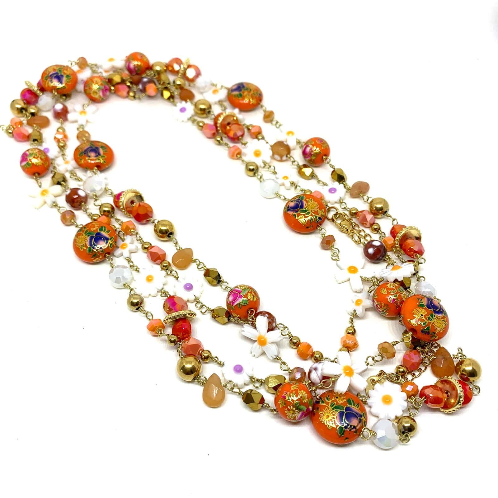 Long necklace with multicolored flower beads, Japanese pearls and faceted glass beads.