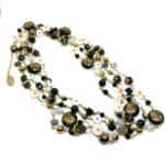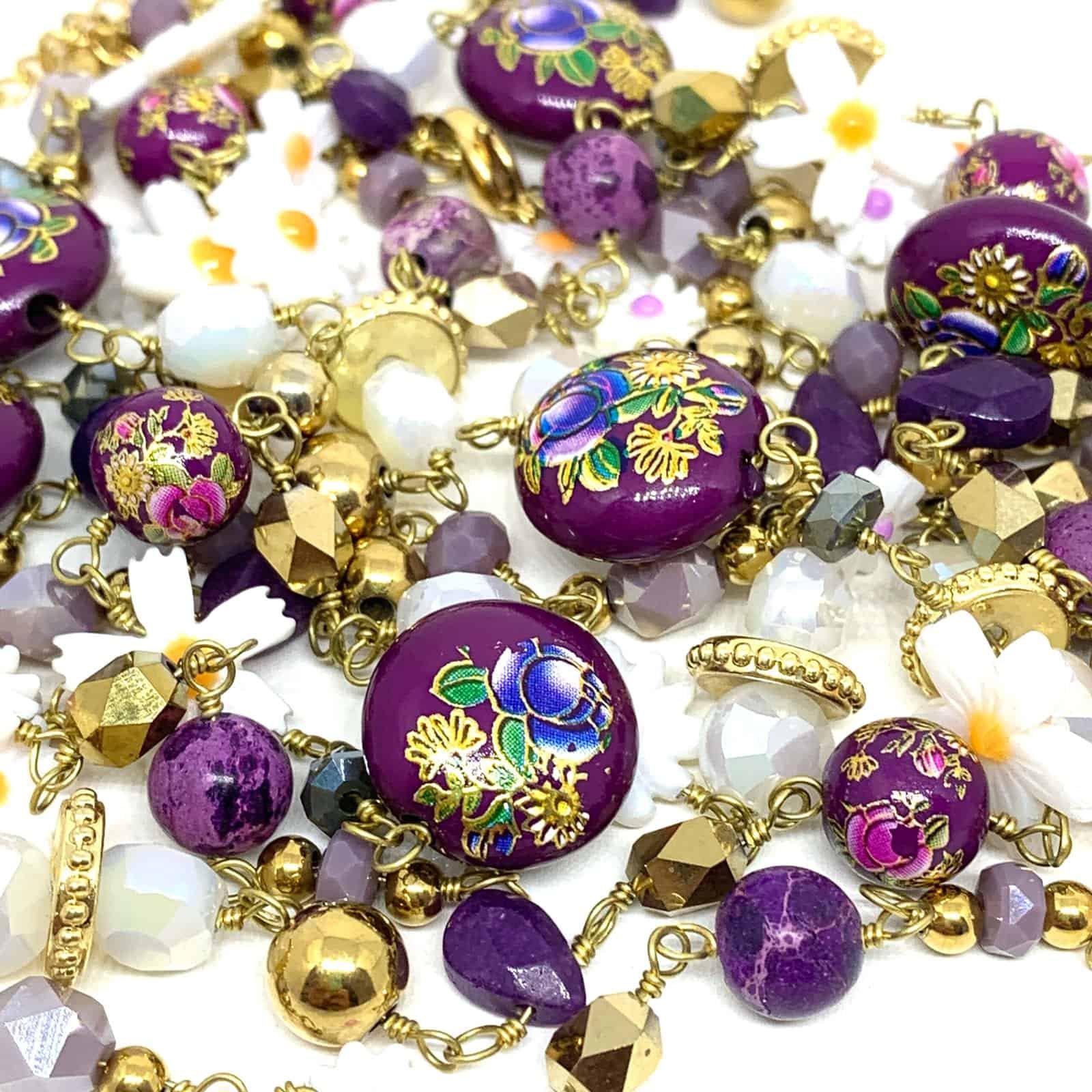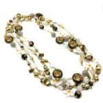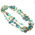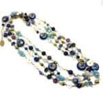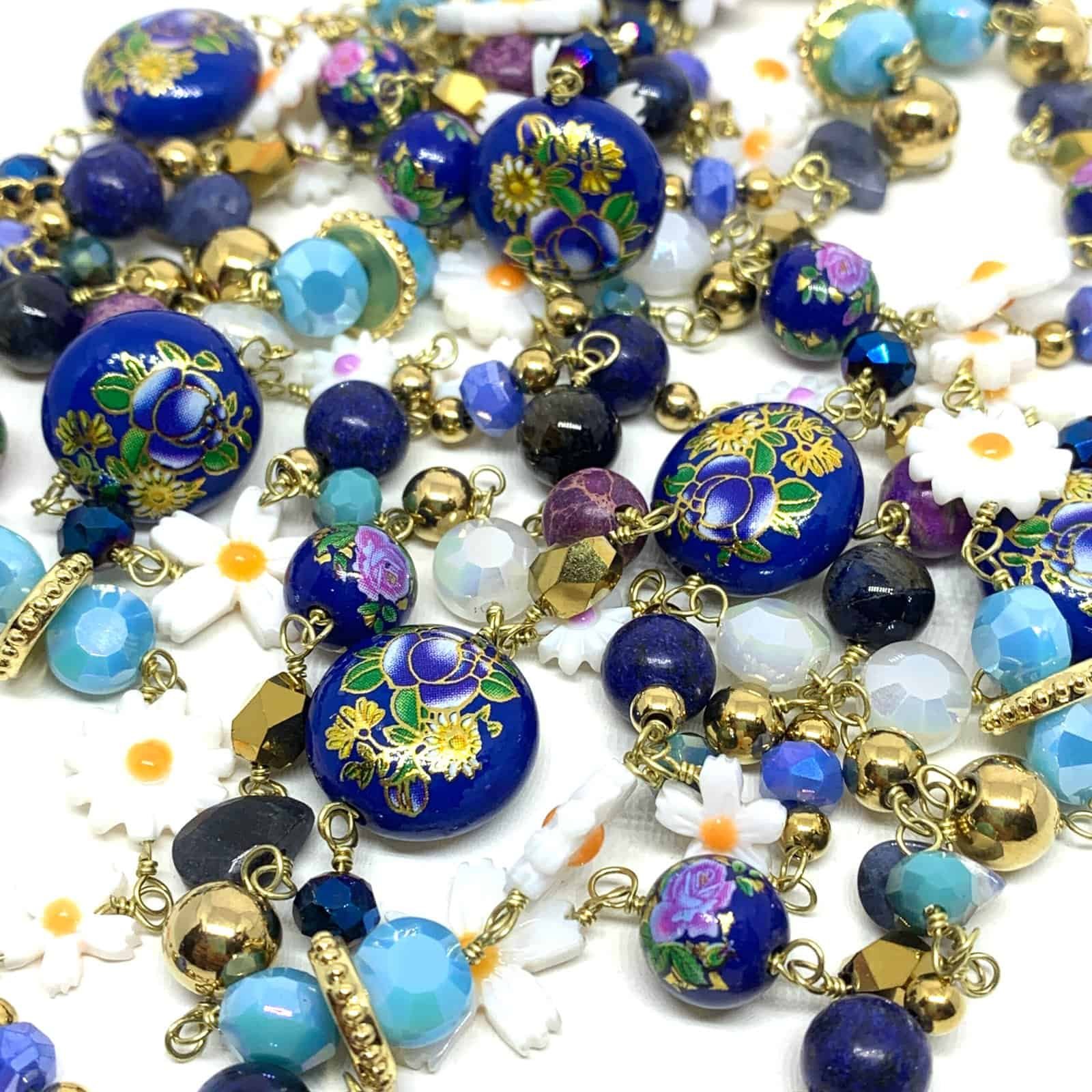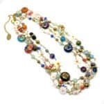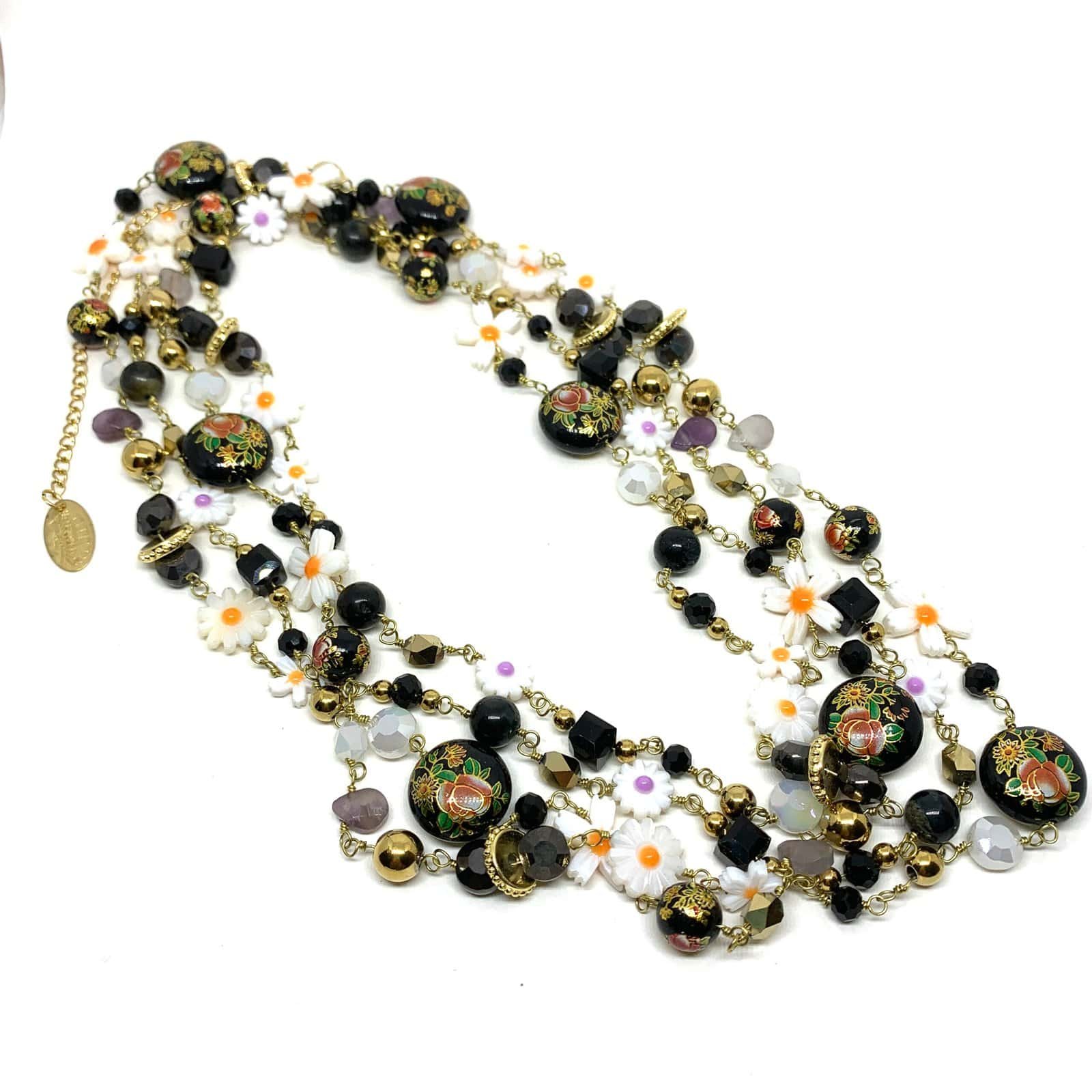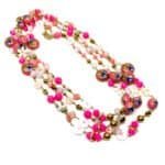 Long necklace with multicolored flower beads, Japanese pearls and faceted glass beads.
