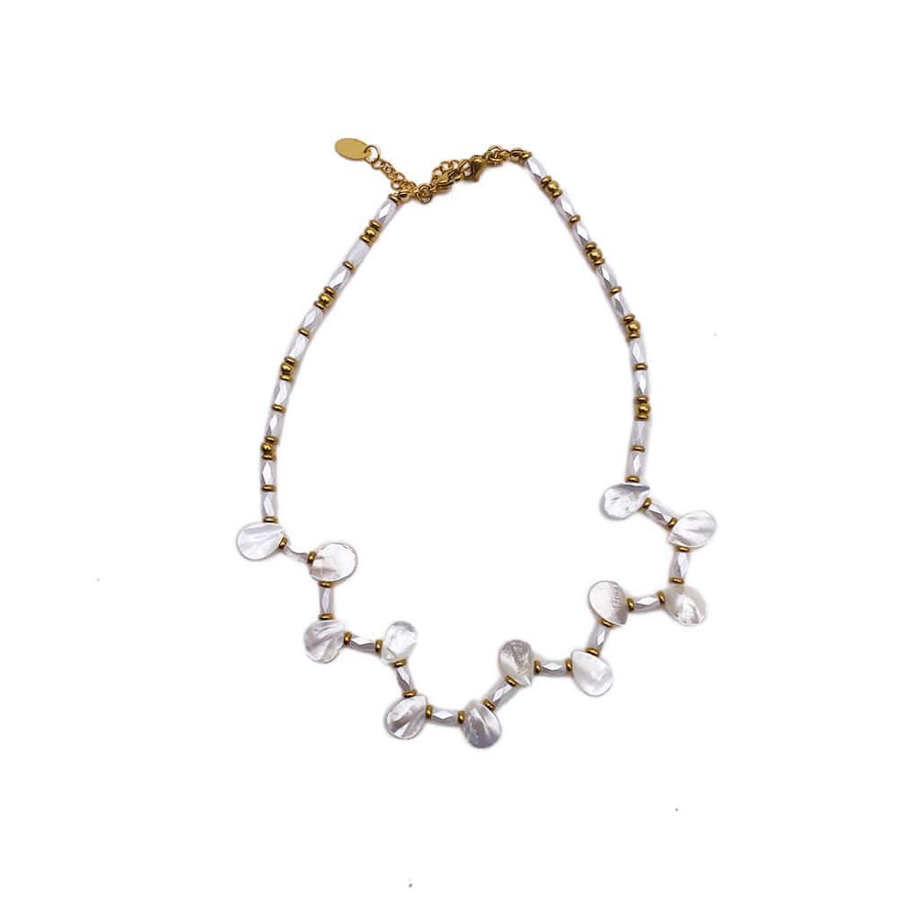 The chain features hammered entrepièces and blue and yellow sttrass beads.